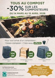 Afin d’encourager la pratique du compostage, du 14 mars au 15 avril 2026, profitez d’une offre spéciale avec le Syndicat Emeraude :