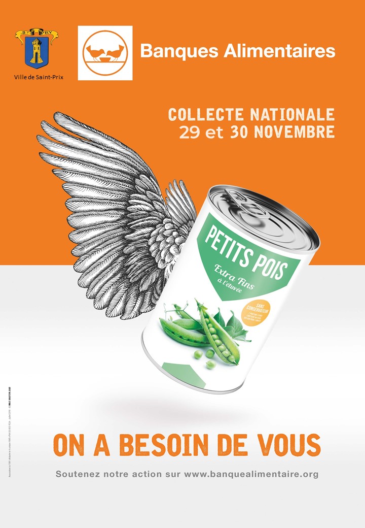 La Ville de Saint-Prix participe à la Banque Alimentaire les 29 et 30 novembre prochains. Depuis 35 ans, les Banques Alimentaires ont pour mot d’ordre la lutte contre le gaspillage alimentaire. Aucune denrée n’est achetée et 65 % des approvisionnements proviennent de produits sauvés du gaspillage : outre la grande distribution, l’industrie agroalimentaire et les producteurs agricoles participent en donnant des articles présentant des défauts d’emballage ou d’étiquetage, des fruits et légumes mal calibrés ou des surplus.